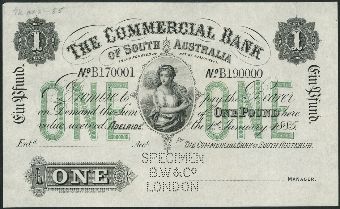 (†) Commercial Bank of South Australia, specimen £1, Adelaide, 2 May 1881, serial number B 170001-B 190000, black and white, value in green at left and right, also text 'Ein Pfund', maiden (Ceres) at centre , reverse value in green at left and right