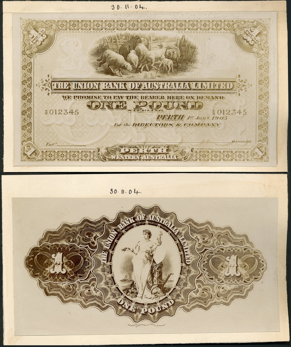 The Union Bank of Australia Limited, obverse and reverse archival photographs showing designs for £1, 1 January 1905, serial number A/2 012345, black and white, sheep and lambs at top centre, value at centre and corners, reverse, female allegory at centre, value at left and right
