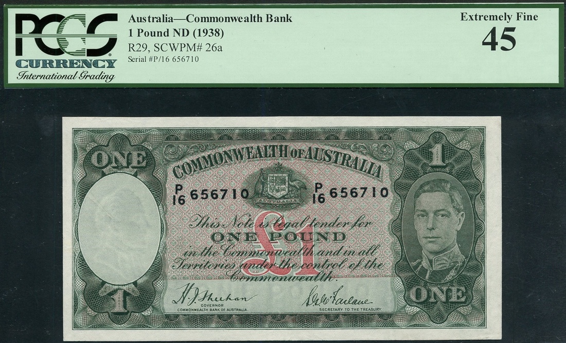 (x) Commonwealth of Australia, £1, ND (1938), serial number P16 656710, dark green on light pink underprint, portrait King George VI a right, arms top centre, value in each corner and at centre, Sheehan/McFarlane signature