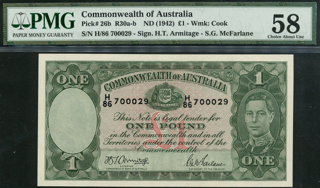 (x) Commonwealth of Australia, £1 (3), ND (1942), prefixes N/74, H/86 and J/47, green on red and green underprint, George VI at right, arms at top centre, value at centre and corners