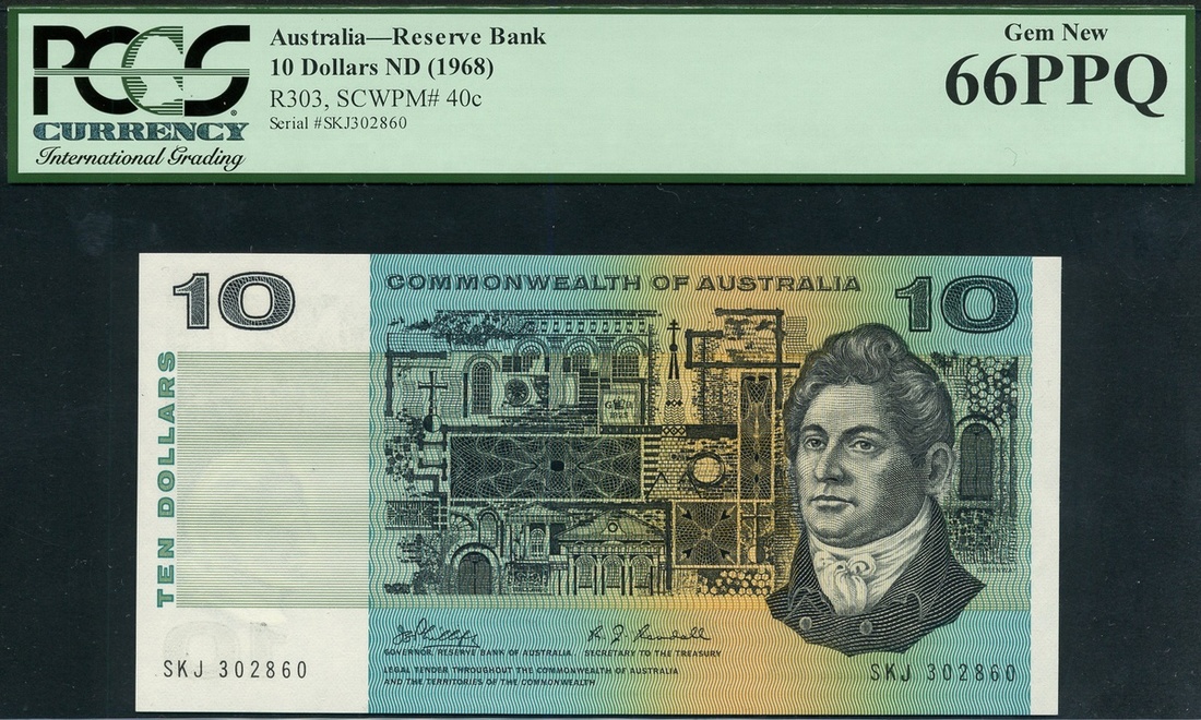 (x) Reserve Bank of Australia, $10 (5), ND (1968), consecutive serial numbers SKJ 302860/5, turquoise green and orange, portrait Francis Greenway at right, Phillips/Randall signature, reverse, portrait Henry Lawson