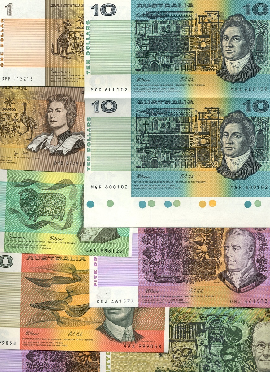(x) Reserve Bank of Australia, a group of notes comprising $20, ND (1968), prefix XCL, $1 (2), $2 (2), $ (5), $10, plus a sheet of two, $20 (2), $50 and $100, all later signatures from the ND 1974-91 issue