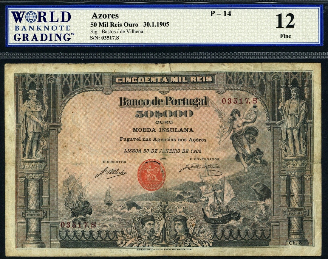 Banco de Portugal, Azores, 50 mil reis, Moeda Insulana, 30 January 1905, serial number 03517.S, grey and pink, galleons and Victory in field, male statue at left and right, red Bank seal at centre, signatures of de Vilhena and Bastos, reverse blue and pink, arms and value