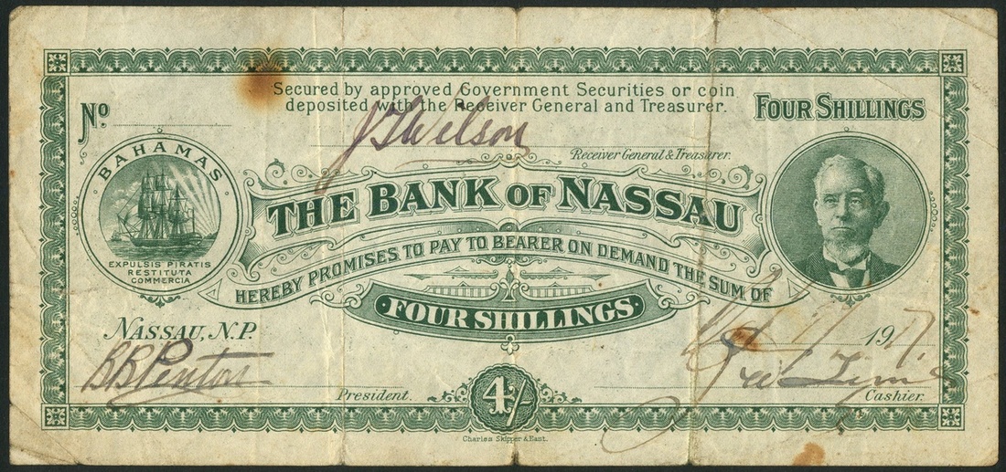 Bank of Nassau, Bahamas, 4 shillings, 17 October 1917, serial number omitted, green and white, man at right, ship seal at left, three manuscript signatures, reverse green