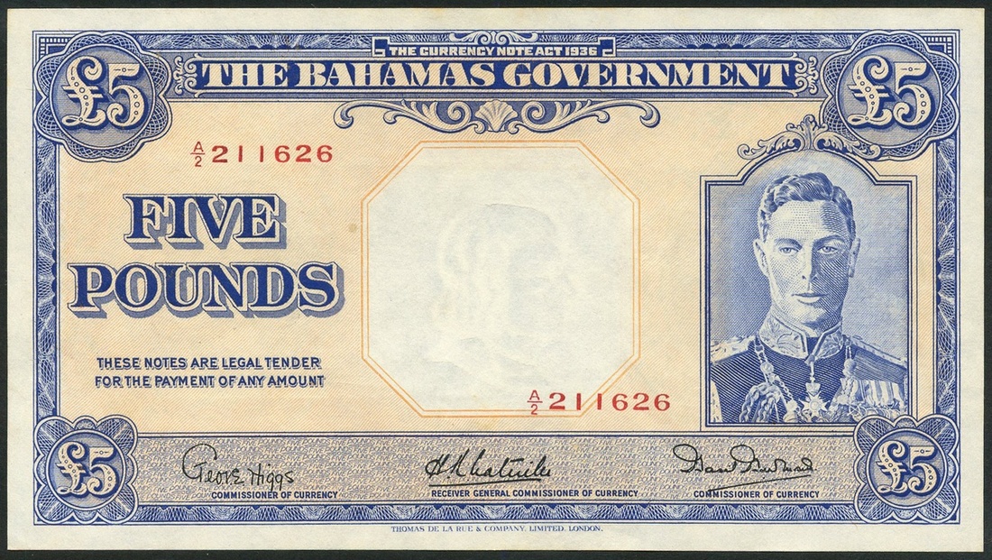 (x) Bahamas Government, £5, ND (1945-46), serial number A/2 211626, blue on tan/orange underprint, George VI at right, sailing ship seal at left, value at corners, reverse blue and multicoloured, arms at left, value at right