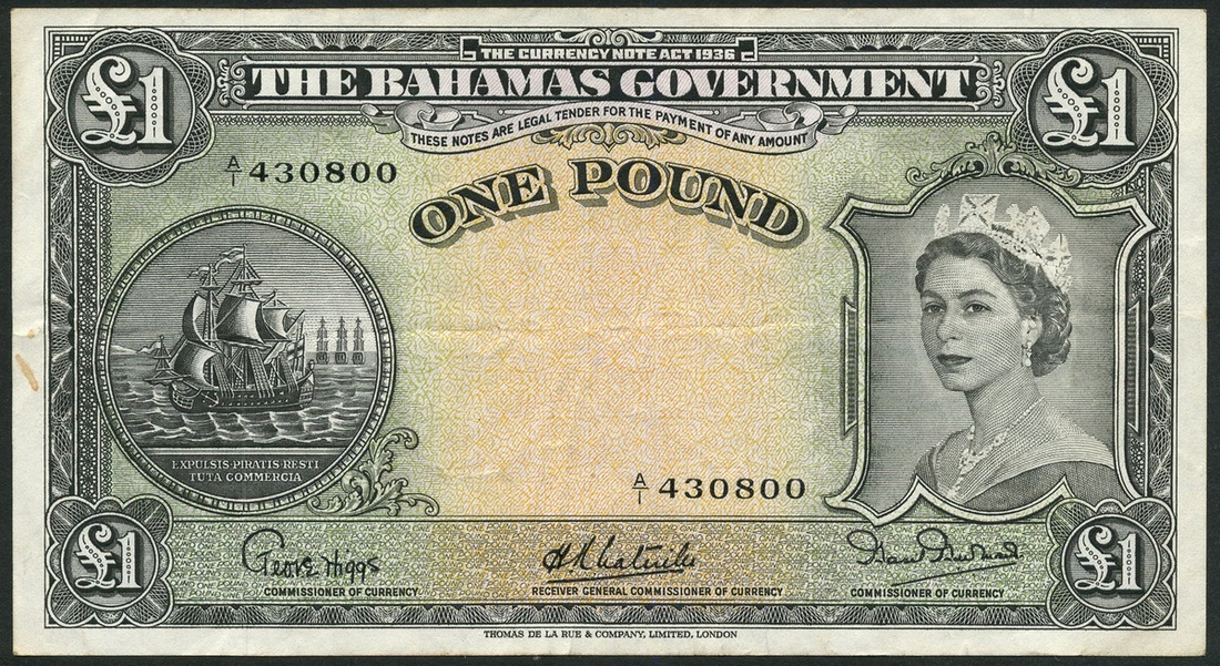 (x) Bahamas Government, 4 shillings, ND (1954), prefix A/3, green, Higgs, Sweeting and Burnside signatures, also £1, ND (1953), prefix A/1, Higgs, Latreille and Burnside signatures, black, both Elizabeth II at right