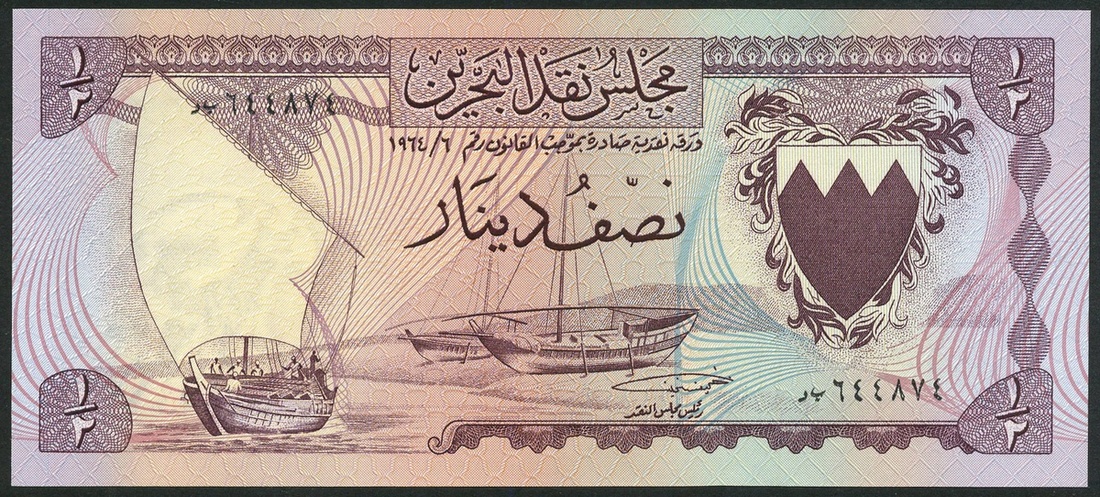 (x) Bahrain Currency Board, 100 fils, 1/4 dinar and 1/2 dinar (2), all ND (1964), all arms at right, dhows at left