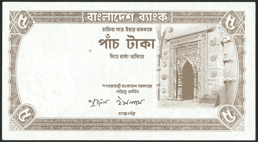 (†) Bangladesh Bank, a selection of printer's proof/specimen 5 Taka, comprising specimen 5 taka (2), (1976), zero serial numbers, pale brown, the Tara Masjid at right, signature Naziruddin Ahmed, a specimen 5 taka, ND (1977), zero serial numbers, pale brown, prayer niche at right, signature Nurul Islam, another with partial reverse, also four partial notes and a booklet containing four stage proofs