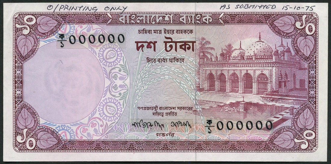 (†) Bangladesh Bank, a partially hand executed essay for a 10 taka, ND (1976), zero serial numbers, lilac, the Tara Masjid at right, signatures of Naziruddin Ahmed attached by hand, also a booklet with four partial stage proofs of the same note