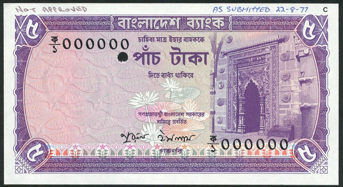 (†) Bangladesh Bank, colour trial 5 taka (2), ND (1977), zero serial numbers, lilac and green and pink, prayer niche at right from the Kusumba Mosque, signatures of Nurul Islam, also a specimen 5 taka in the correct pale brown colour with manuscript 'Approved 1/9/77' in field