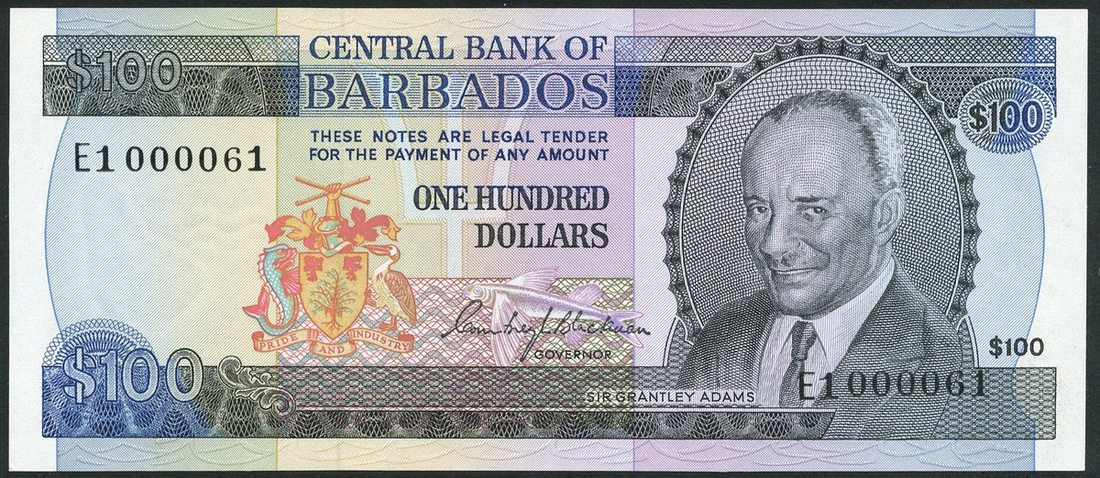 Central Bank of Barbados, $1, A1 000049, red, $2, H 20 000001, blue, $5 (2), G16 000086, G24 000009, green, $10, C1 000045 and $20, D1 000041, violet and $100, E1 000061, lilac