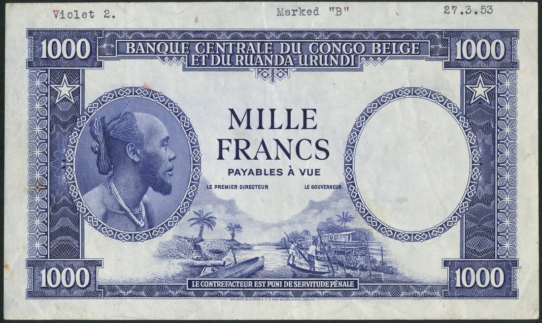 Banque Centrale du Congo-Belge et du Ruanda-Urundi, obverse die proof 1000 francs, ND (1953), blue print, Moliro man at right, ornate border, value in each corner, vignette of river scene centre at low centre