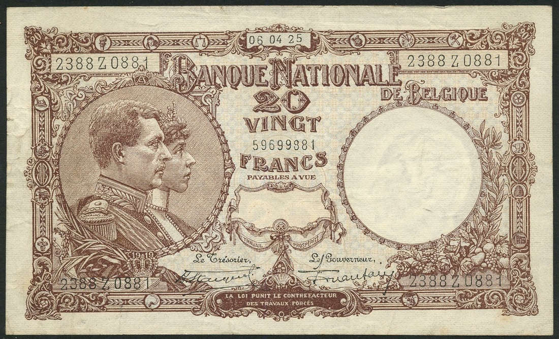 Banque Nationale de Belgique, 5 francs, 1925, 20 francs, 1925, 5 francs (3), 1918, 1919, 1921, 20 francs, 1919, 100 francs, 1920, Societe Generale 1 and 2 francs, Banque Nationale 100 francs, 1927, 50 francs (3), 5 francs (2) and 20 francs (2), TRESORERIE overprint, 100 francs, 1928, 500 francs, 1943, 1000 francs, 1943, 100 francs (4),