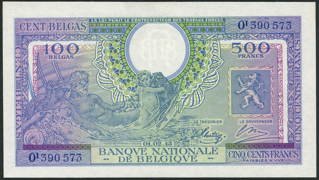Banque Nationale, Belgium, 100 belgas/500 francs, 1 February 1943, serial number O1 390573, mauve and green, allegorical figures, Sontag and Theumis signatures