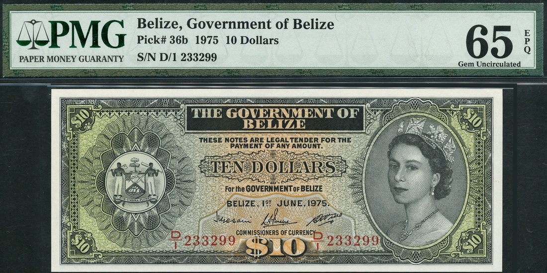 (x) Government of Belize, $10, 1 June 1975, serial number D/1 233299, black on multicolour underprint, Elizabeth II at right, arms at left