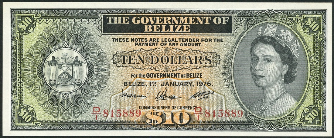 (x) Government of Belize, $10, 1 January 1976, red serial number D/1 815889, black, green and orange, Elizabeth II at right, arms at left, value top centre and at each corner