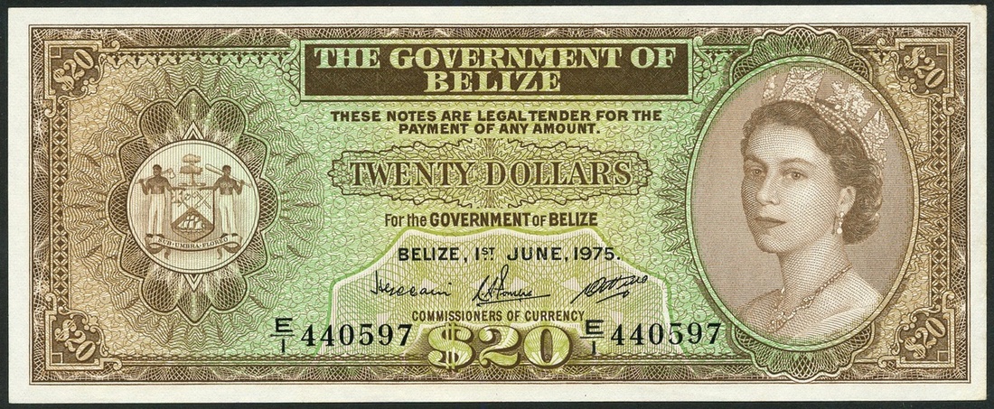 (x) Government of Belize, $20, 1 June 1975, serial number E/1 440597, brown on multicolour underprint, Elizabeth II at right, arms at left