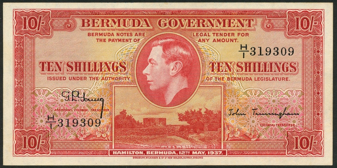 (x) Bermuda Government, 10 shillings, Hamilton, 12 May 1937, serial number H/1 1319309, red, George VI and Gates Fort at centre, Young and Trimingham signatures, reverse red and green, arms at centre, value at left and right