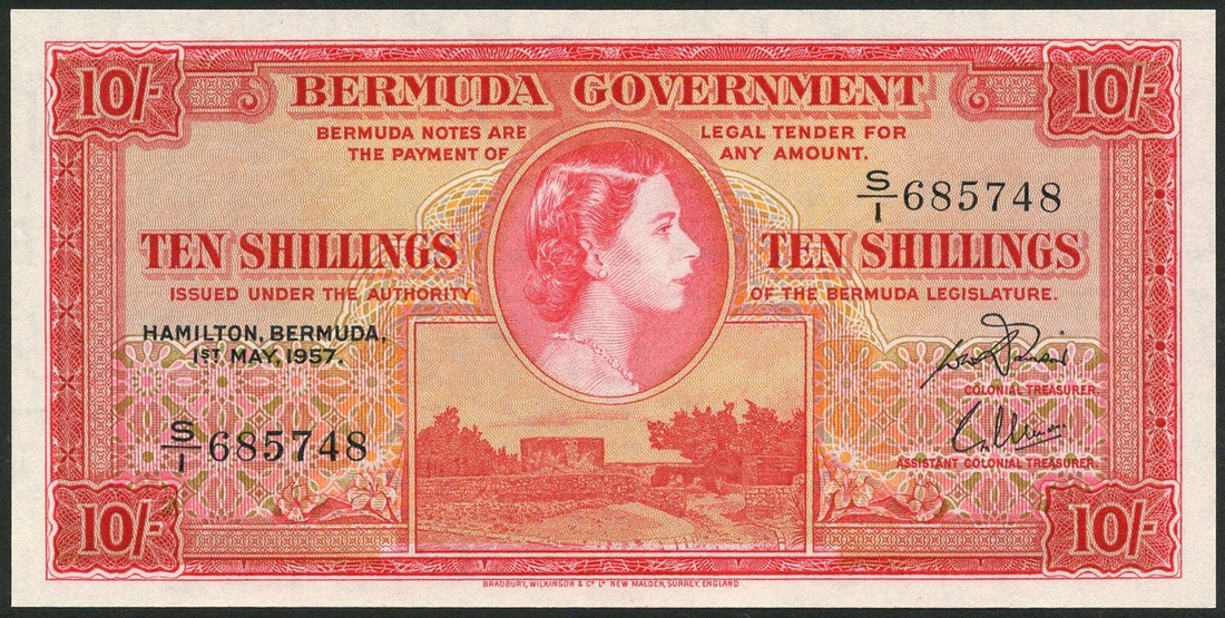 Bermuda Government, 10 shillings (2), 1 May 1957, consecutive serial numbers S/1 685747/748, red on multicolour underprint, Queen Elizabeth II at centre, Gates Fort low centre, value left and right and at each corner, Lumsden and Davidson signatures, reverse, red and green, arms at centre, value at left and right