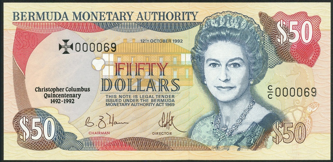 Bermuda Monetary Authority, $50, 1992, serial number 000069, brown-yellow and multicoloured, Elizabeth II at right, Spanish cross in field, $10, 1997, serial number B/2 200029, blue