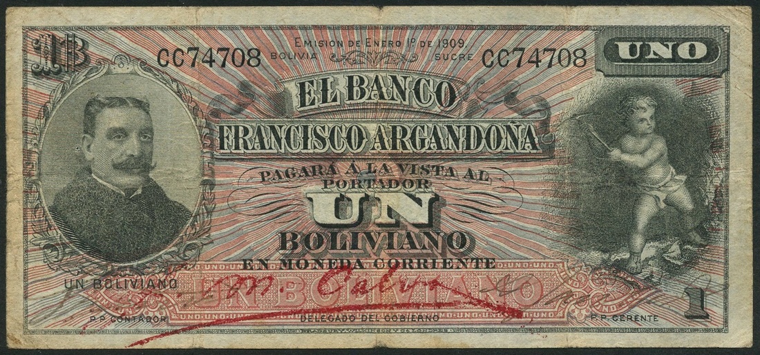 El Banco Francisco Argandona, 1 boliviano, 1 January 1909, serial number CC74708, black on red and blue underprint, Argandona at left, cherub with pick at right