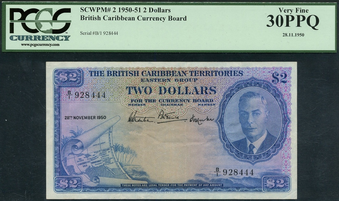 (x) British Caribbean Territories, Eastern Group, $2, 28 November 1950, serial number B/1 928444, blue on multicolour underprint, George VI at right, map scroll at left, value at each corner, reverse blue, arms and seals at corners, King in Biga drawn by Hippocampus at top centre