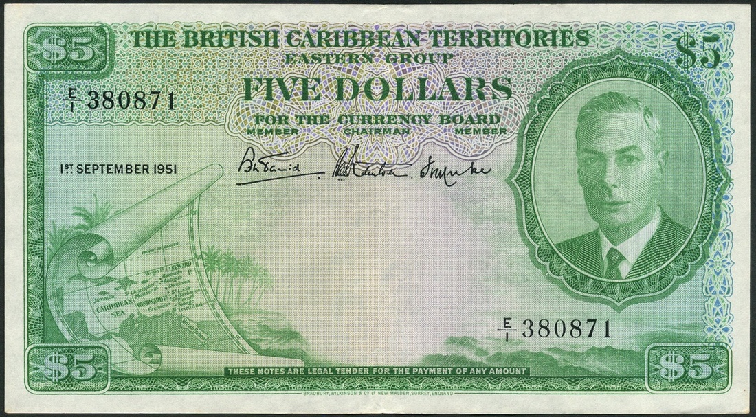 British Caribbean Territories, Eastern Group, $5, 1 September 1951, serial number E/1 380871, green and lilac, George VI at right, map low left, reverse green, arms
