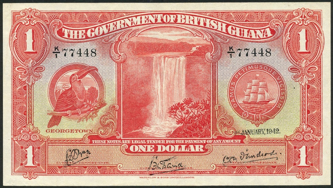 (x) Government of British Guiana, $1, 1 January 1942, serial number K/1 77448, red and pale green, toucan at left, arms at right, Kaiteuer Falls at centre, Owen, McDavid and d'Andrade signatures, reverse red