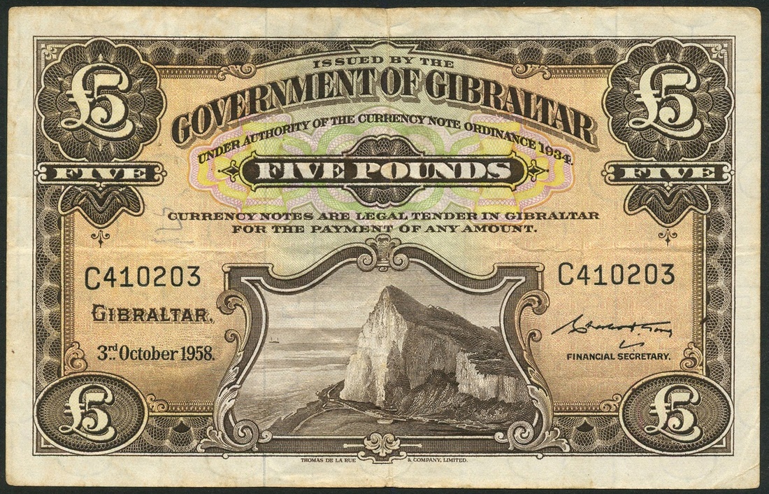 (x) Government of Gibraltar, £5 (2), 3 October 1958, serial number C410203, 20 November 1975, serial number D802700, brown on multicolour underprint, Rock of Gibraltar at low centre, value at top centre and each corner, reverse brown, arms at centre, value at left and right