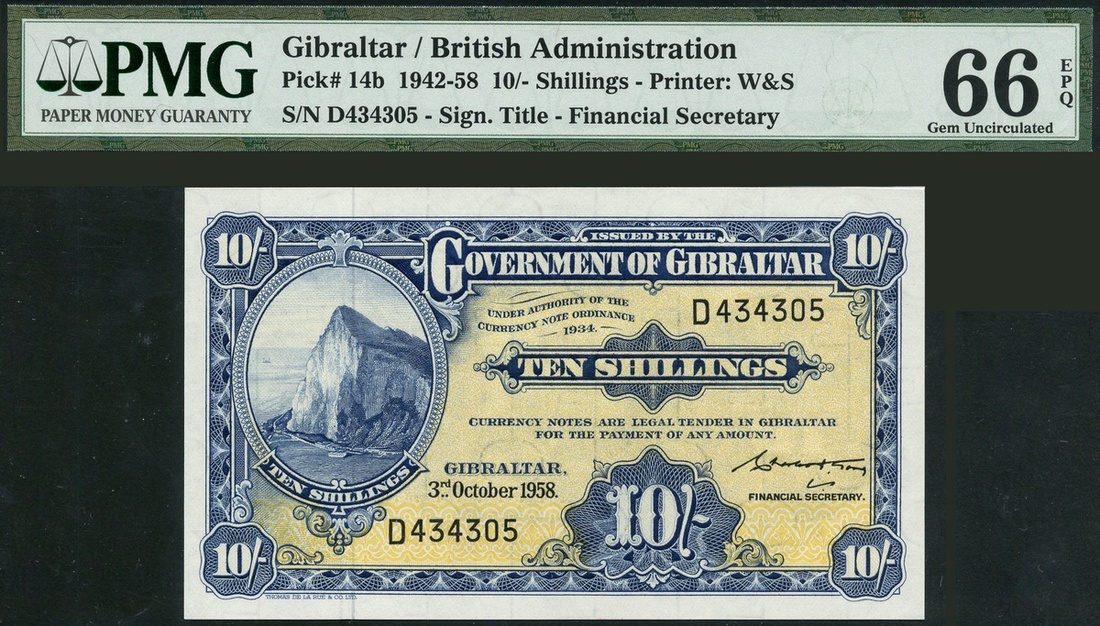 (x) Government of Gibraltar, 10 shillings, 2 October 1958 (DLR printing), serial number D434305, blue on yellow underprint, Rock of Gibraltar at left