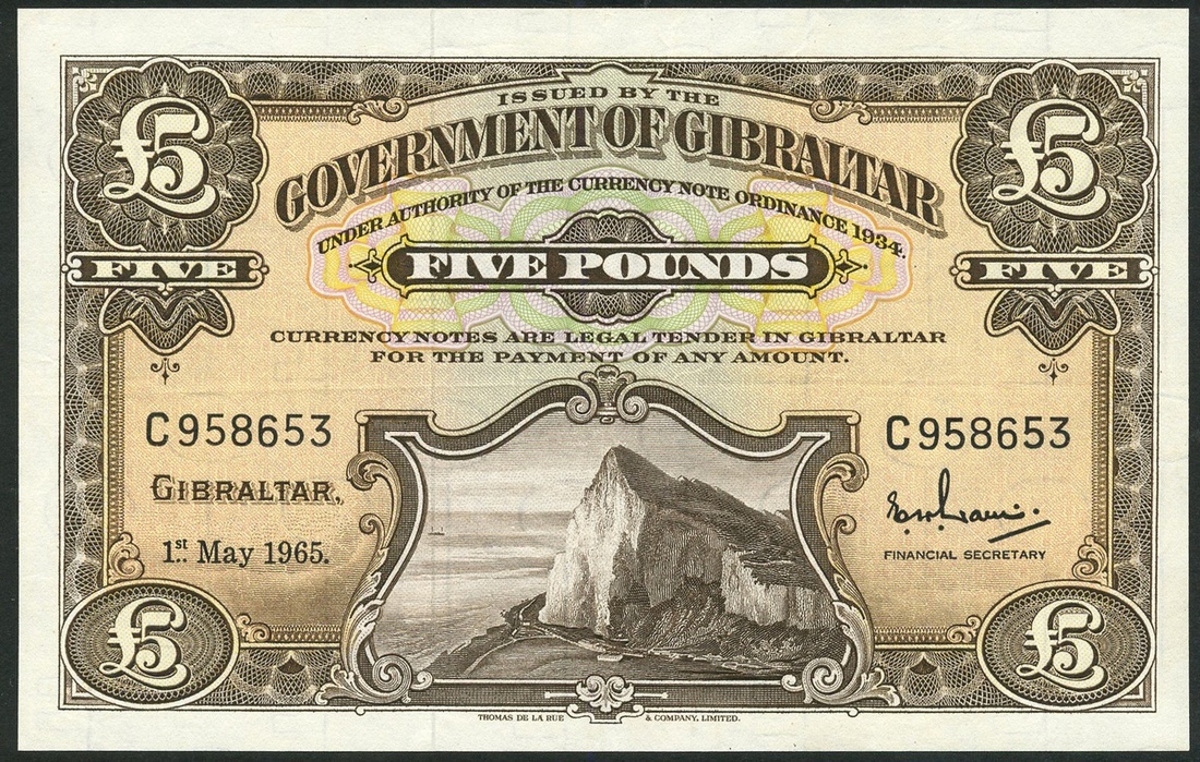 Government of Gibraltar, £5, 1 May 1965, black serial number C 958653, brown and pink-orange, the Rock at low centre, value top centre and at each corner, signature of Ernest Davis at right, reverse brown and white, arms at centre, value at left and right
