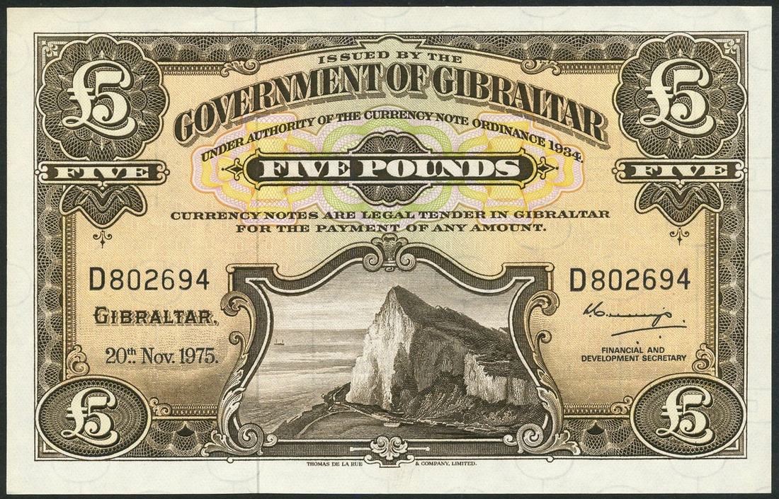 (x) Government of Gibraltar, consecutive £5, 20 November 1975, serial number D802694-5, brown on multicolour underprint, Rock of Gibraltar at low centre, value at top centre and each corner, reverse brown, arms at centre, value at left and right
