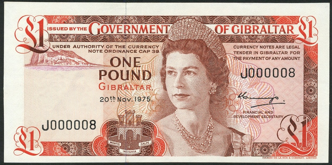 Government of Gibraltar, £1, serial number J 000008, red, £5, E 000004, green, both Elizabeth II at right, arms low centre, Alistair Collings signature