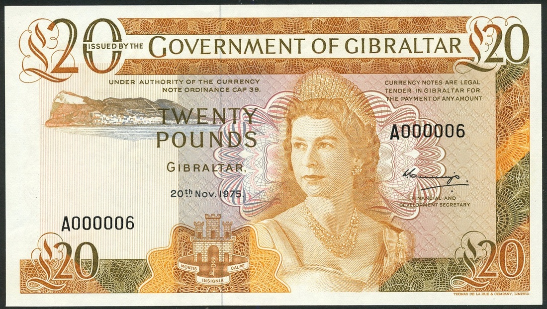 Government of Gibraltar, £20, 20 November 1975, serial number A 000006, orange-brown, Elizabeth II and arms in field and signed by Alistair Collings