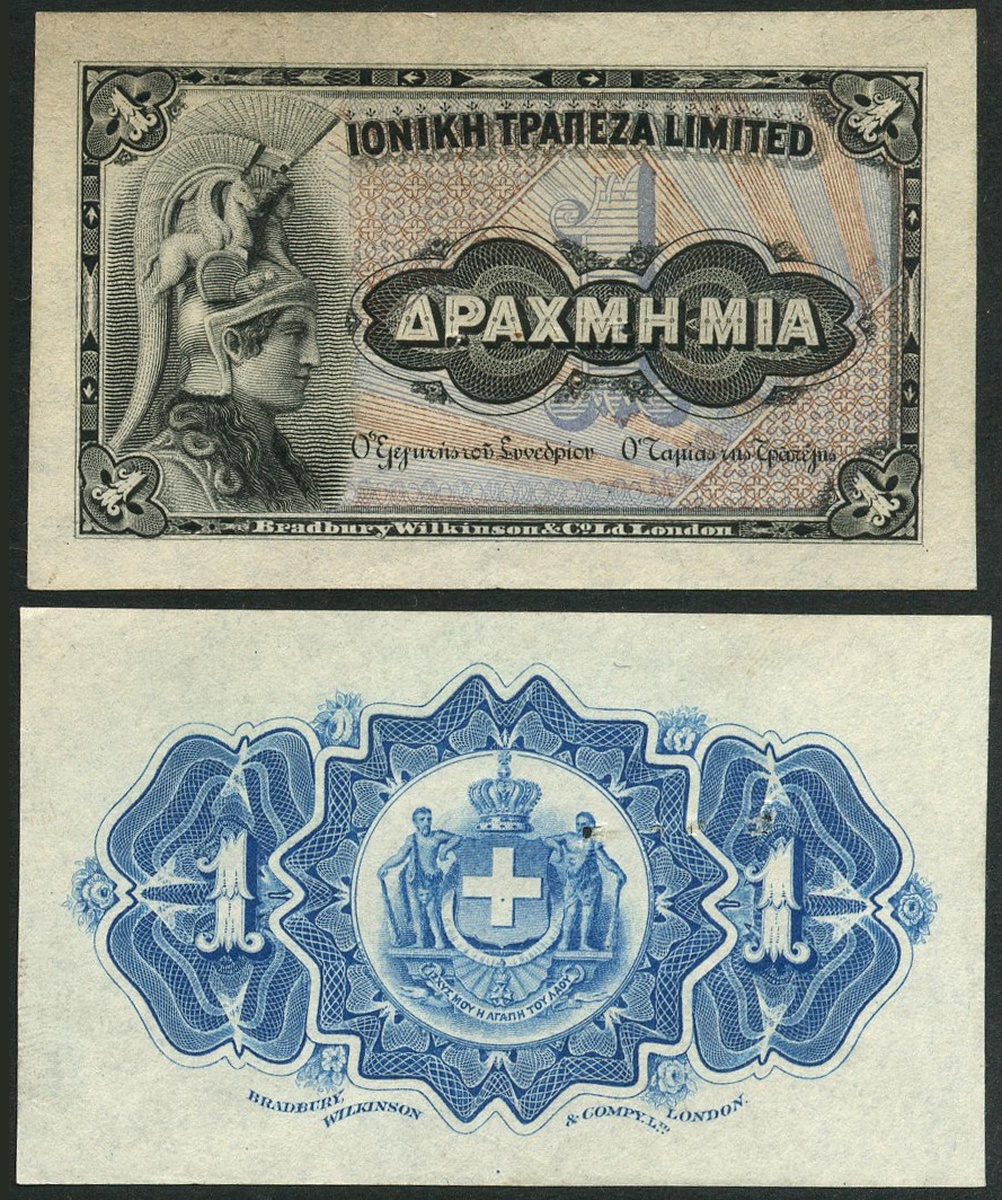 (†) Ionian Bank Limited, a selection of reverse proofs comprising 1 drachma (2), one brown , one green, 2 drachmai (3), one green, one blue, one brown, all arms at centre, value at left and right, also uniface obverse 1 drachma