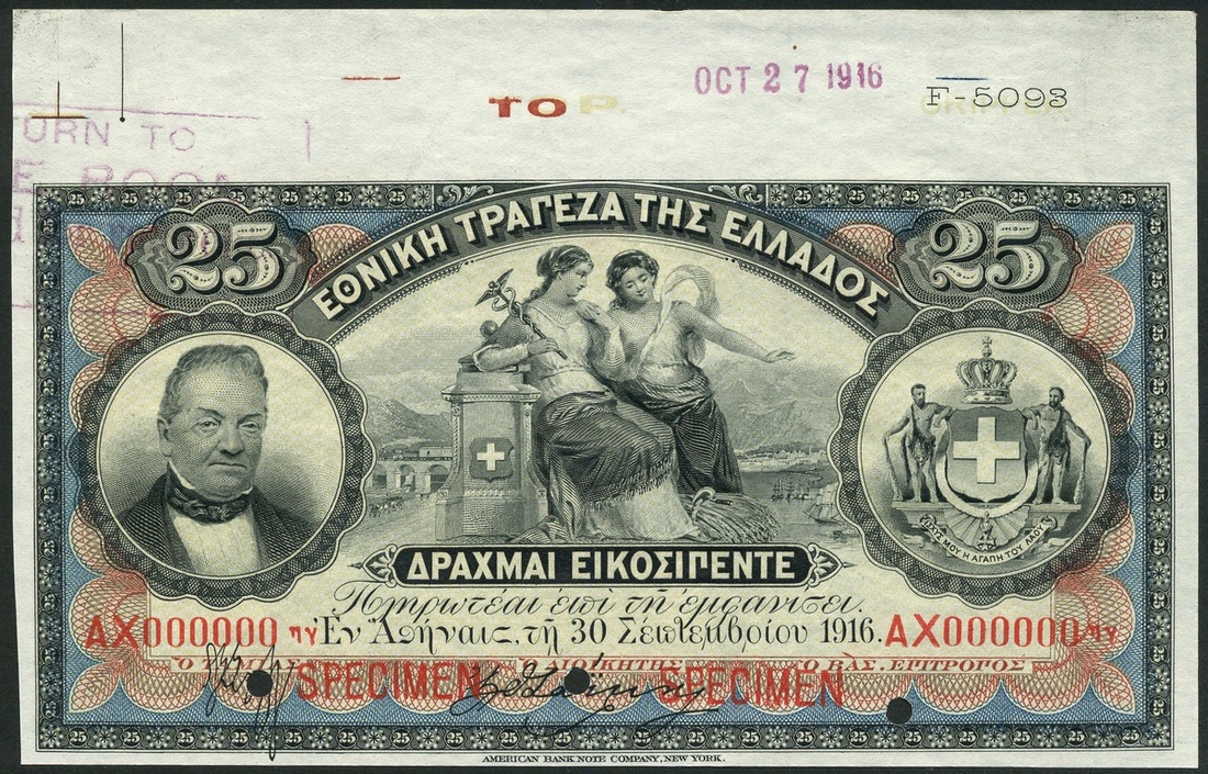 (x) National Bank of Greece, specimen 25 drachmai, 1916, serial number AX 000000, black on multicolour, specimen 5 drachmai, 1917, serial number B02601 000000, black on brown and blue, both with G Stavros at left, arms of King George I at right, red SPECIMEN overprint, hole punched