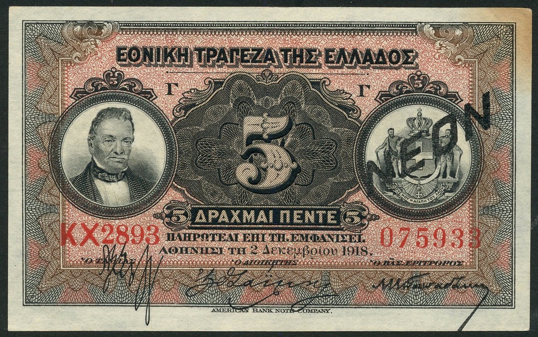 National Bank of Greece, 5 drachmai (6), 1914, 1915 (2), 1916, 1917, 1918, all red serial numbers, black, brown and pale blue, George Stavros at left, arms at right, value at centre, reverse brown and pale blue, helmeted head of Athena at centre, 5 drachmai (2), 1923, black and multicoloured and a 5 drachmai 'Provisional issue', ca 1928, brown with black handstamp BANK OF GREECE handstamp low right