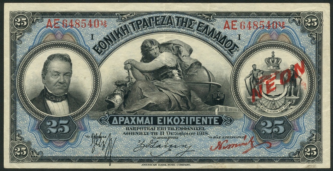 National Bank of Greece, 25 drachmai (3), August/October/December 1918, red serial numbers, black, pale brown and pale blue, George Stavros at left, arms at right, allegorical maiden at centre, Zaimis signature, red NEON at right, reverse black, pale brown and pale blue, allegorical maidens at centre