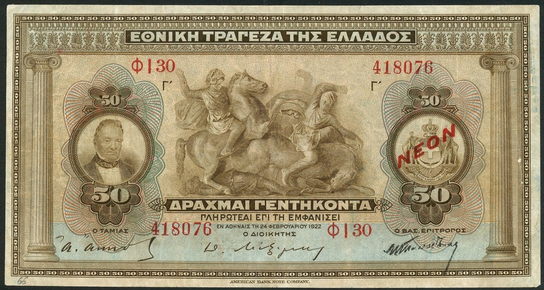 National Bank of Greece, 50 drachmai, 24 October 1922, red serial number 30-418076, brown and pale blue, George Stavros at left, arms and red NEON at right, classical frieze at centre of Alexander the Great, three signatures below, reverse blue, coin with Alexander III portrait at centre, value at left and right and at each corner