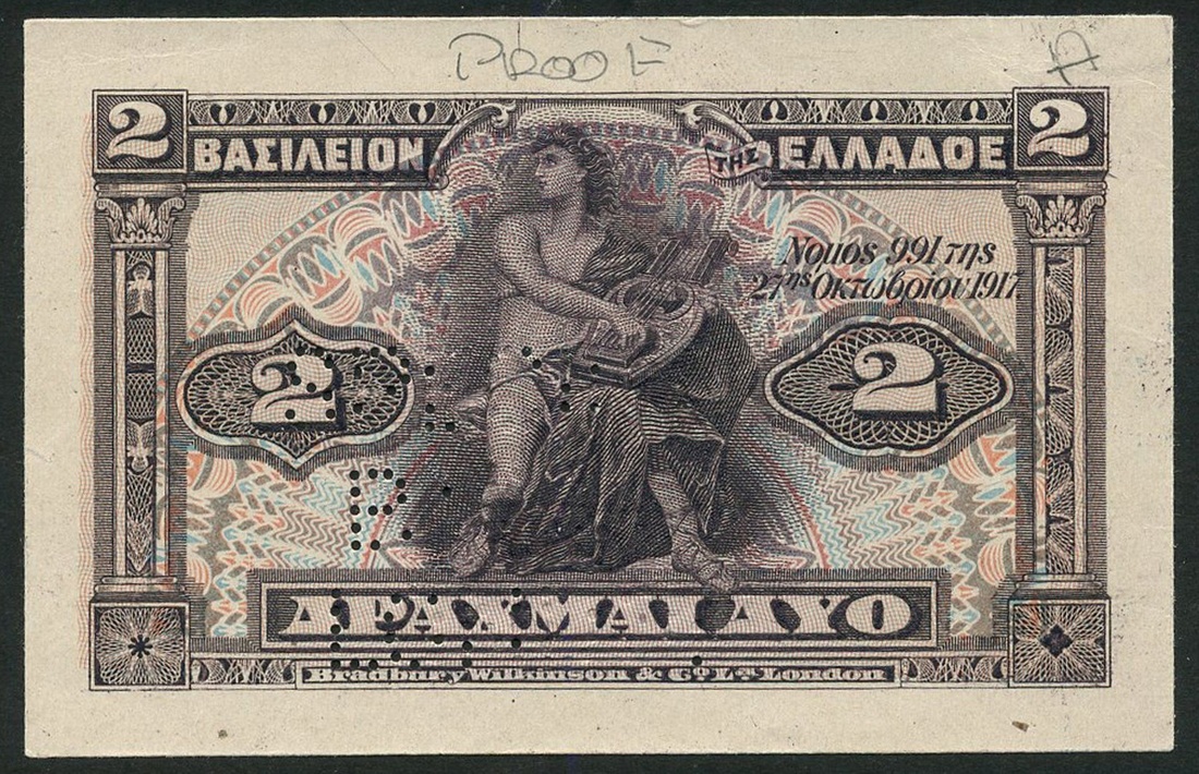 (†) Kingdom of Greece, Ministry of Finance, a proof 2 drachmai, 1917, purple, Orpheus and lyre at centre, value at left and right, reverse pale blue and mauve, value at left and right