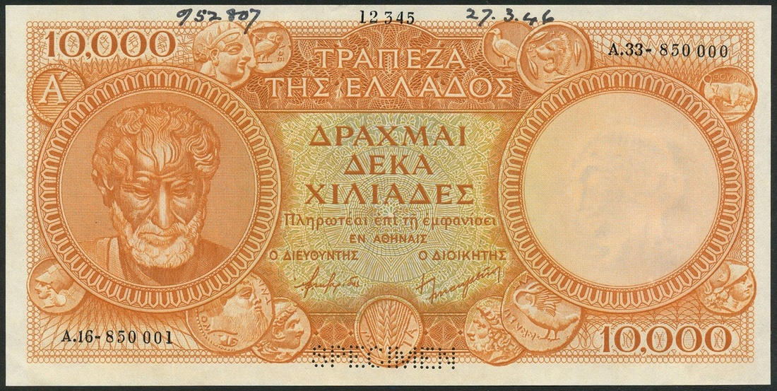 (†) Bank of Greece, Post World War II, specimen 10000 drachmai, ND (1945), serial number A16 850001-A33 850000, orange and pale green, Aristotle at left, classical coins around borders, reverse orange, charioteer at centre, also a specimen 10000 drachmai, ND (1947), serial number P01 000000, as previous but smaller format