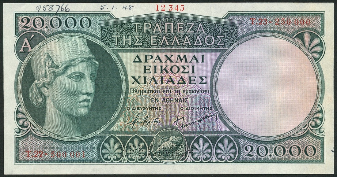(†) Bank of Greece, Post World War II, specimen 20000 drachmai (2), ND (1946), serial number prefix T.22 and T.23, green and pale pink, Athena at left, Athenian coin low centre, reverse green, cockerel at centre, Medusa in background