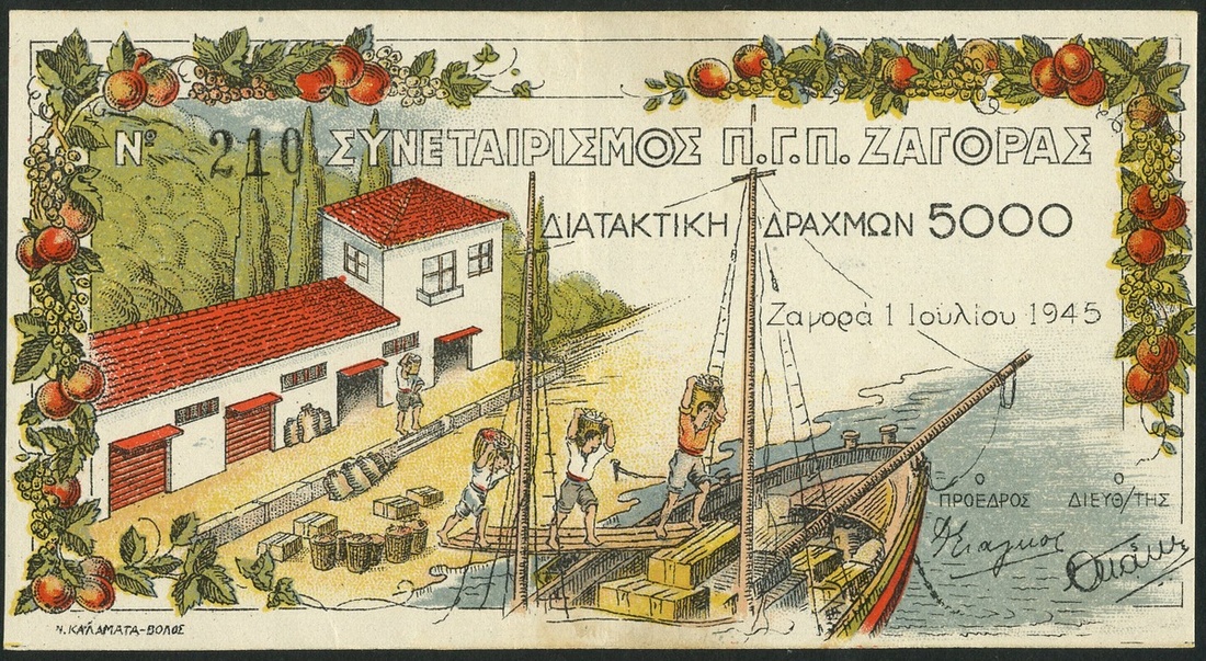 Co-Operative Credit notes of Zagora, Greece, a set comprising 100, 500 and 1000 and 5000 drachmai, 1945, all are red and multicoloured, boat loading at quayside, no handstamps on obverse or reverse, first manuscript number 17, second handstamped 771, third handstamped 9893 and the fourth handstamped 210