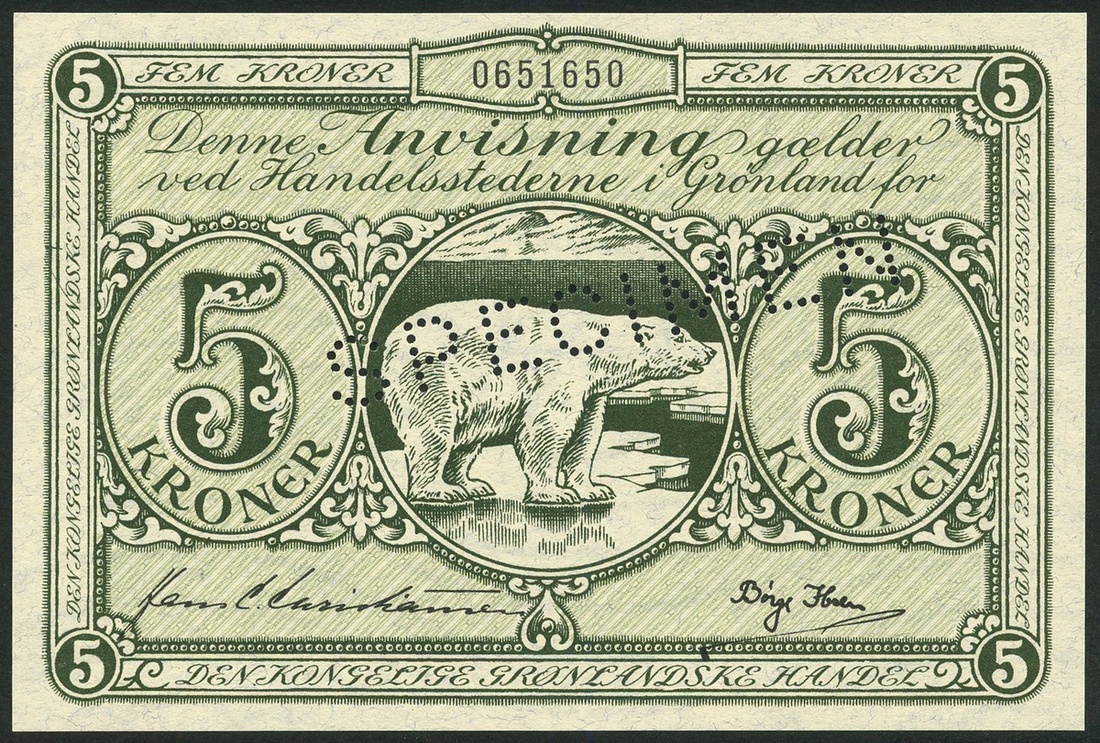 (x) Greenland, State Notes, specimen 5 kroner, ND (1953-67), serial number 0651650, dark green on light green underprint, polar bear at centre flanked by value, reverse, value in each corner