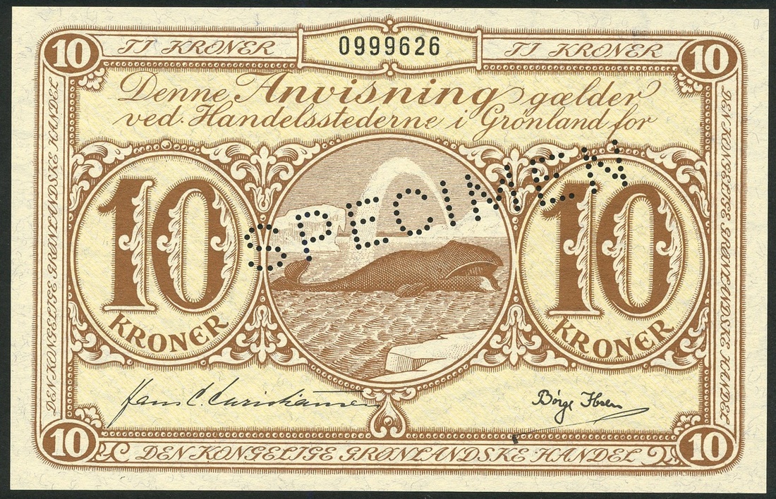(x) Greenland, State Notes, specimen 10 kroner, ND (1953-67), serial number 0999626, brown on yellow underprint, hump-back whale at centre flanked by values, reverse map of Greenland, crowned polar bear and arms at centre