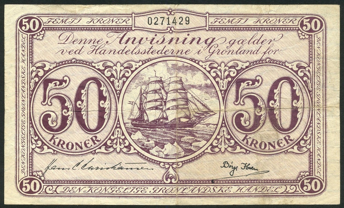 (x) Greenland, State Notes, 50 Kroner, ND (1953-67), serial number 0271429, purple on lilac underprint, sailing ship at centre flanked by values, Christensen signature, reverse map of Greenland, polar bear and arms at centre