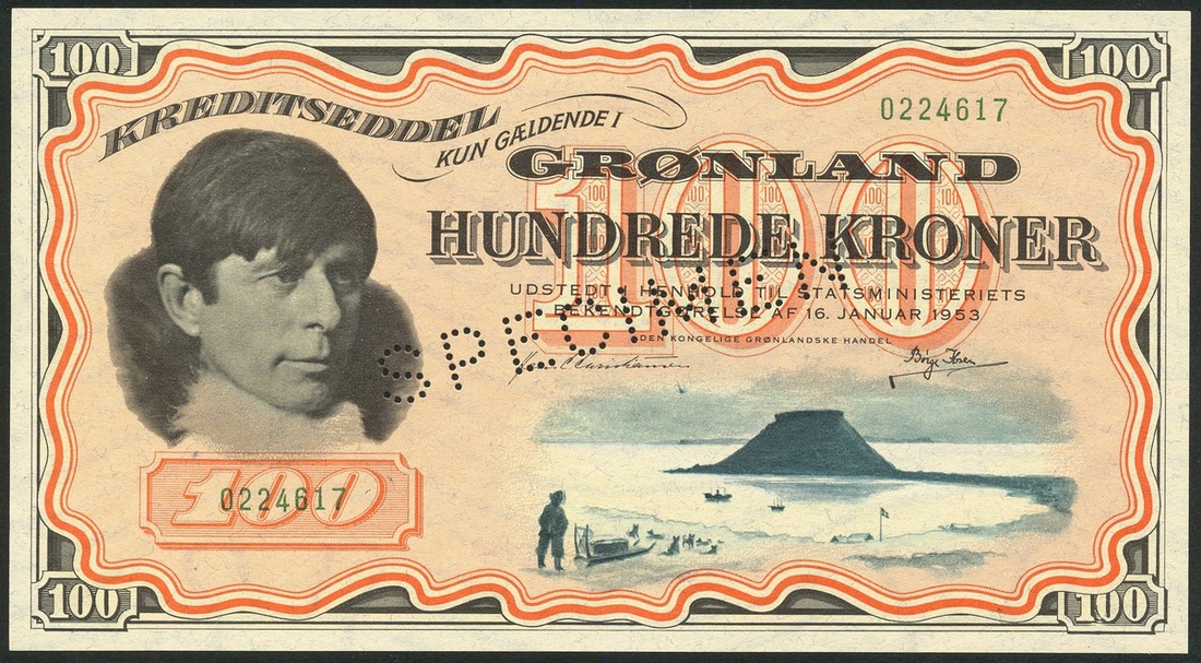 (x) Greenland, State Notes, specimen 100 kroner, 1953, serial number 0224617, black, orange and dark blue, portrait of Knud Rasmussen at left, Thule Rock and dog sled at low right, value at centre left and each corner, reverse red, map of Greenland at right, crown at top left