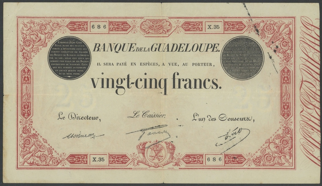 Banque de la Guadeloupe, 25 francs, ND (1934), serial number X.35-686, black text on red and white, ornate border around, signatures of Devineau, Gascon and Picard