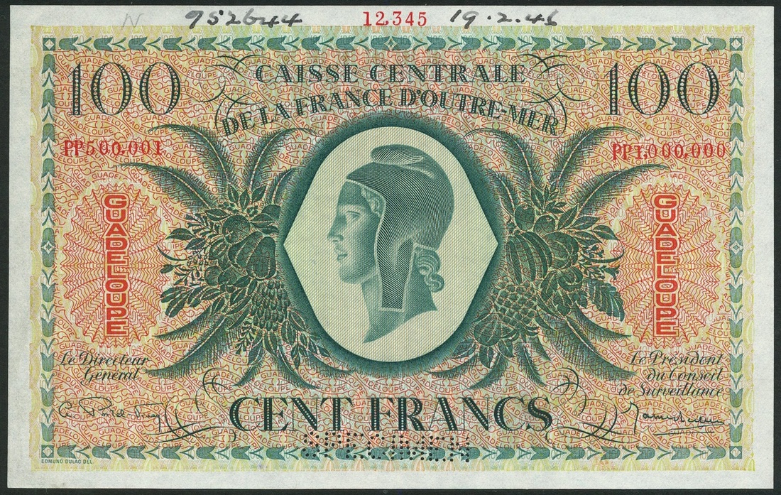 (†) Caisse Centrale de la France d'Outre-Mar, Guadeloupe, specimen 10 francs, violet, specimen 20 francs, green and specimen 100 francs, green, all with red zero serial numbers, ND (ca 1945-1946), all head of Liberty in Phrygian cap at centre and GUADELOUPE in red at left and right, signatures of Postel-Vinay and LeClerc
