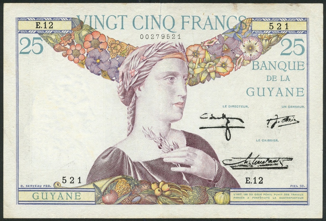 Banque de la Guyane, 5 francs, ND (1946), prefix R.51, blue and white, native head at left and right, Buy and Constantin signatures, 25 francs, prefix E.12, multicoloured, France at centre, Halleguen, Constantin and Saint Clair signatures